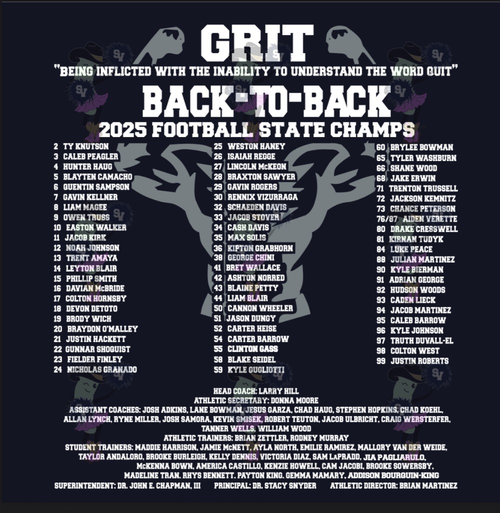 We are so proud of our football players, coaches, staff, families, and fans as our boys bring home the Back-to-Back WIN once again. This incredible achievement is a testament to the hard work, dedication, and Ranger pride that defines our boys, coaches and community. We are both honored and excited to present the NEW 2025 SVHS Back-to-Back State Champions Apparel to celebrate this milestone! Featuring the front designed by one of our own SVHS Graphic students, Shout out to Parker Julian, also an athlete (Cross Country/Track) for her incredible talent and creativity put into the front design. The back displays the 2025 complete roster.