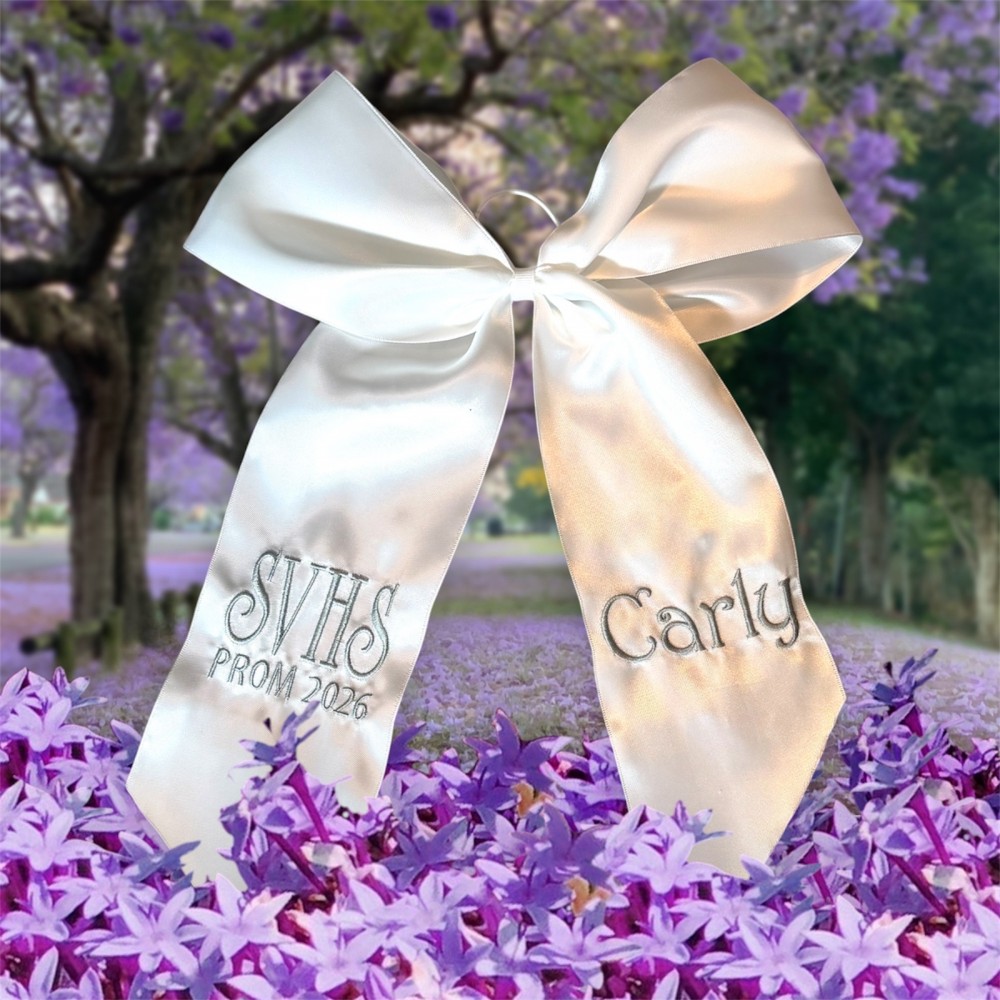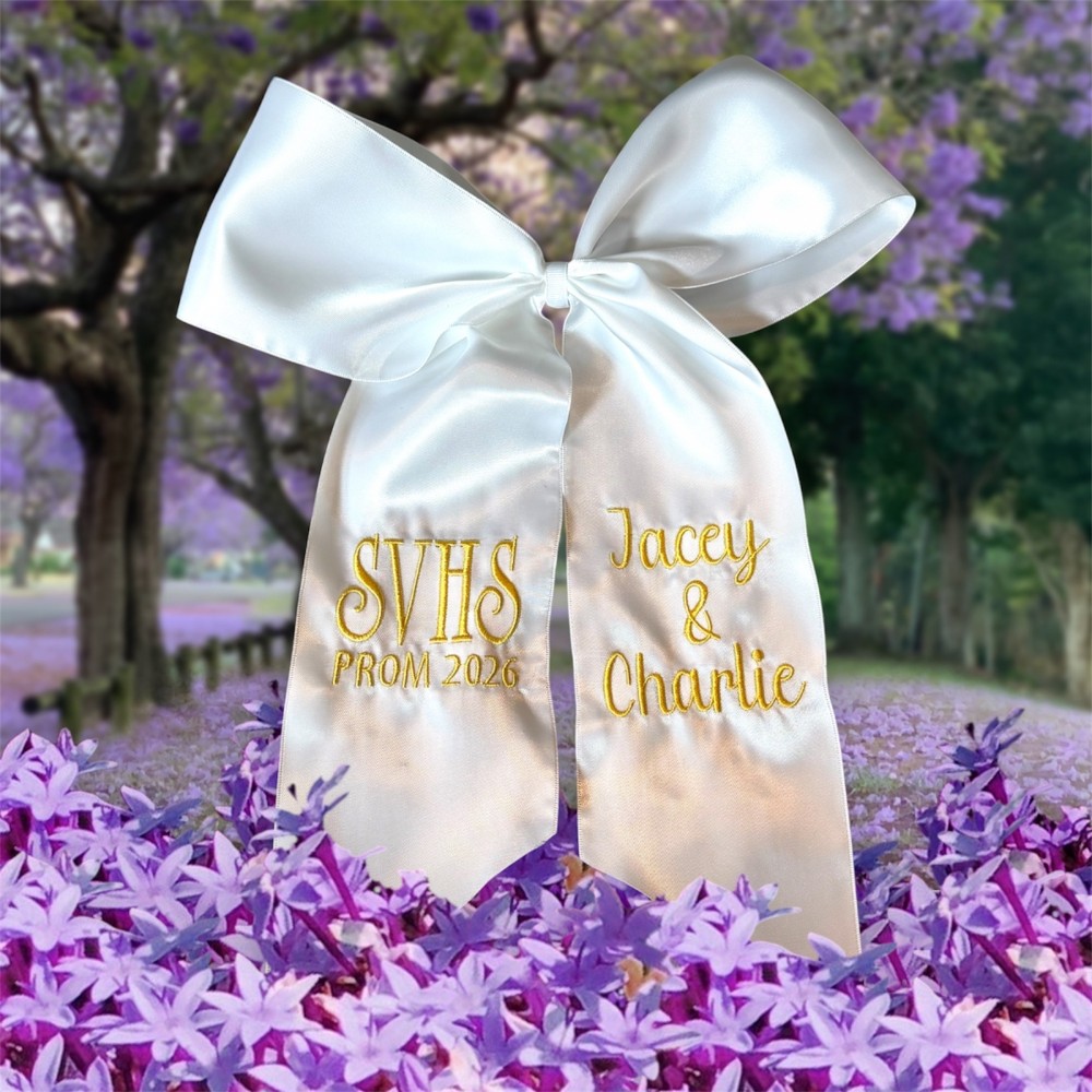 This embroidered bouquet ribbon wrap is crafted from soft, high-quality ribbon and delicately embroidered initials, monograms or custom designs. Whether you're wrapping a homecoming or prom floral bouquet, a bridal bouquet, bridesmaid flowers, or a special gift, this ribbon adds a personalized, heirloom-quality touch. The wrap ties beautifully around stems, securing them with grace while adding texture and charm to your arrangement. Ideal for school dances, weddings, anniversaries, or keepsakes.