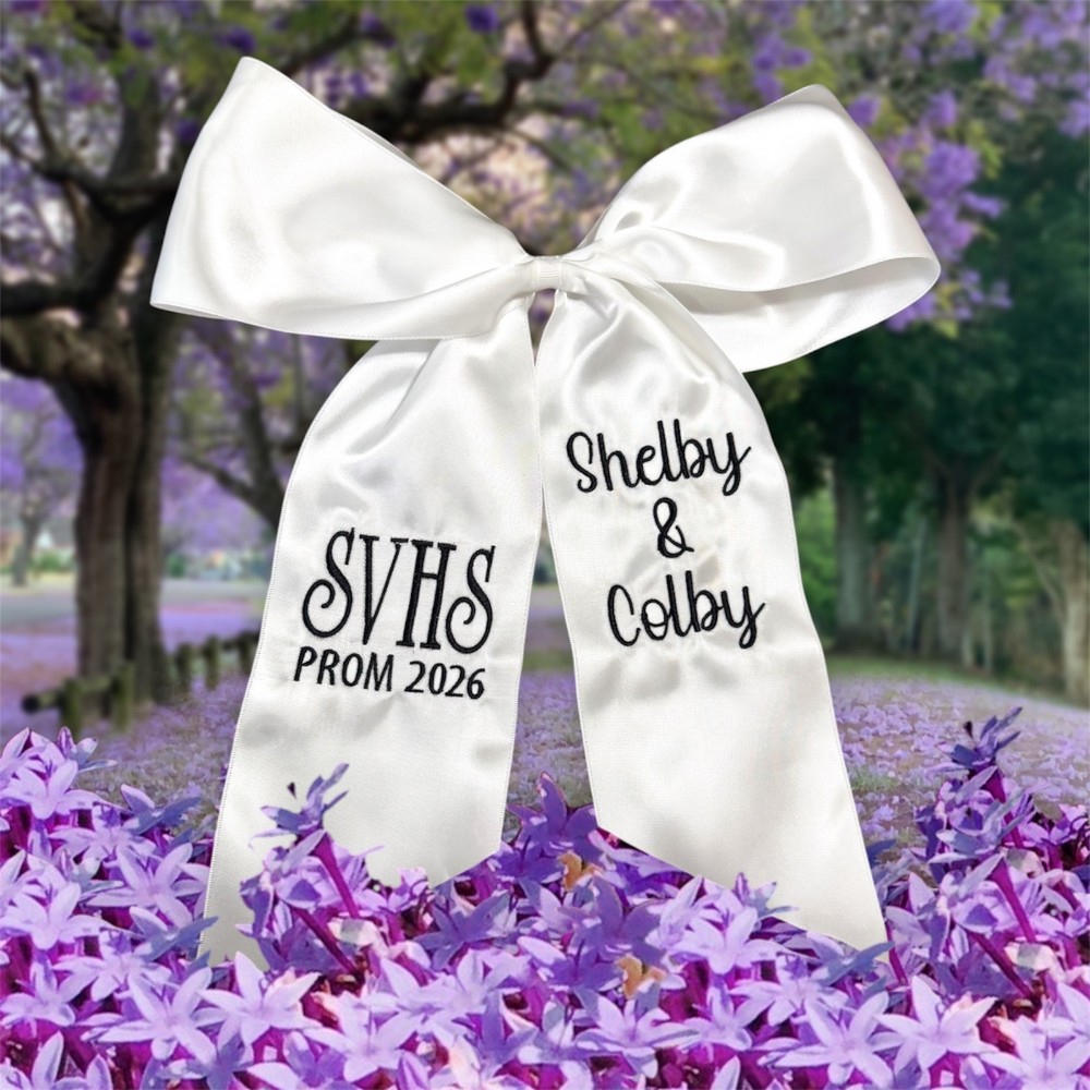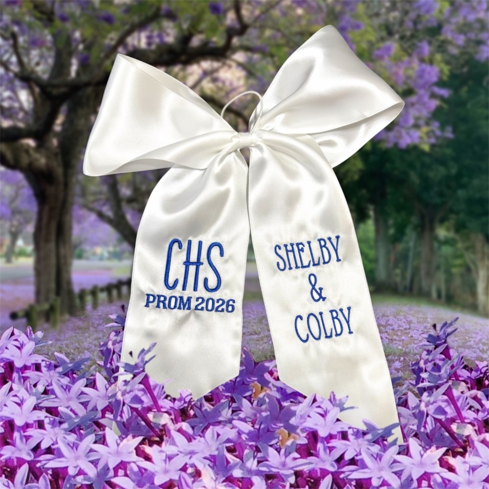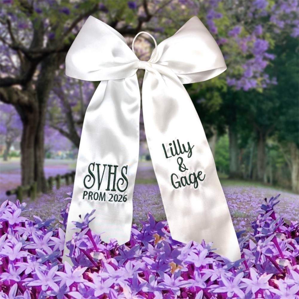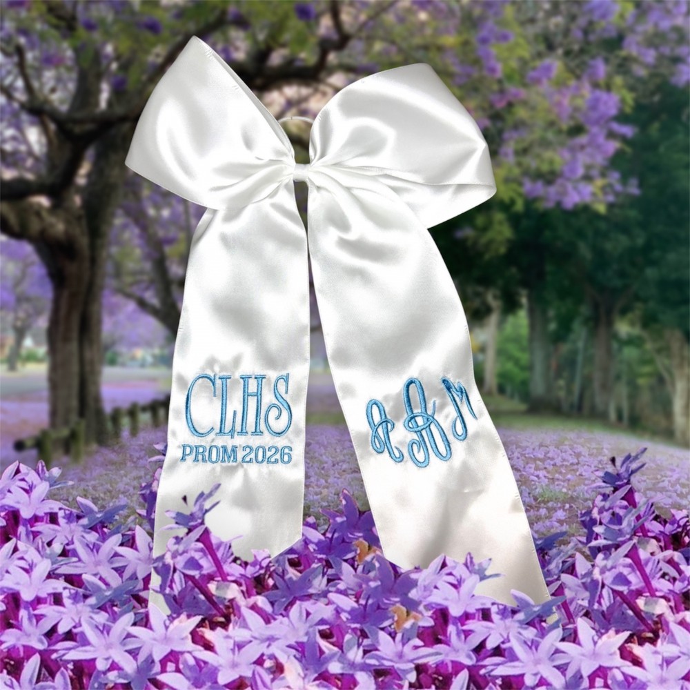 This embroidered bouquet ribbon wrap is crafted from soft, high-quality ribbon and delicately embroidered initials, monograms or custom designs. Whether you're wrapping a homecoming or prom floral bouquet, a bridal bouquet, bridesmaid flowers, or a special gift, this ribbon adds a personalized, heirloom-quality touch. The wrap ties beautifully around stems, securing them with grace while adding texture and charm to your arrangement. Ideal for school dances, weddings, anniversaries, or keepsakes.