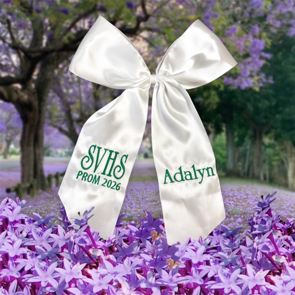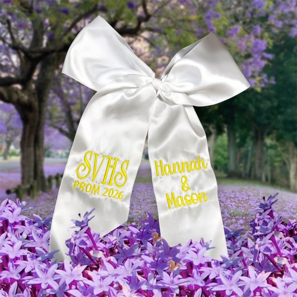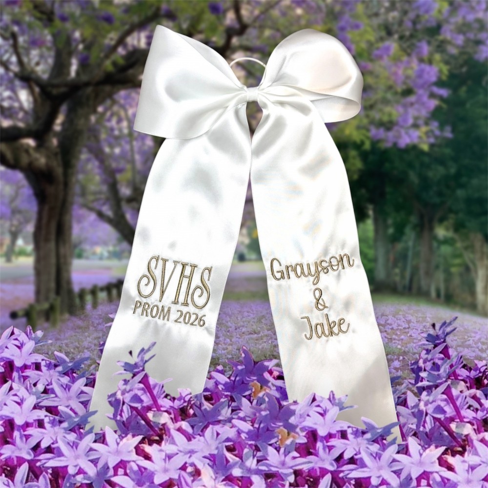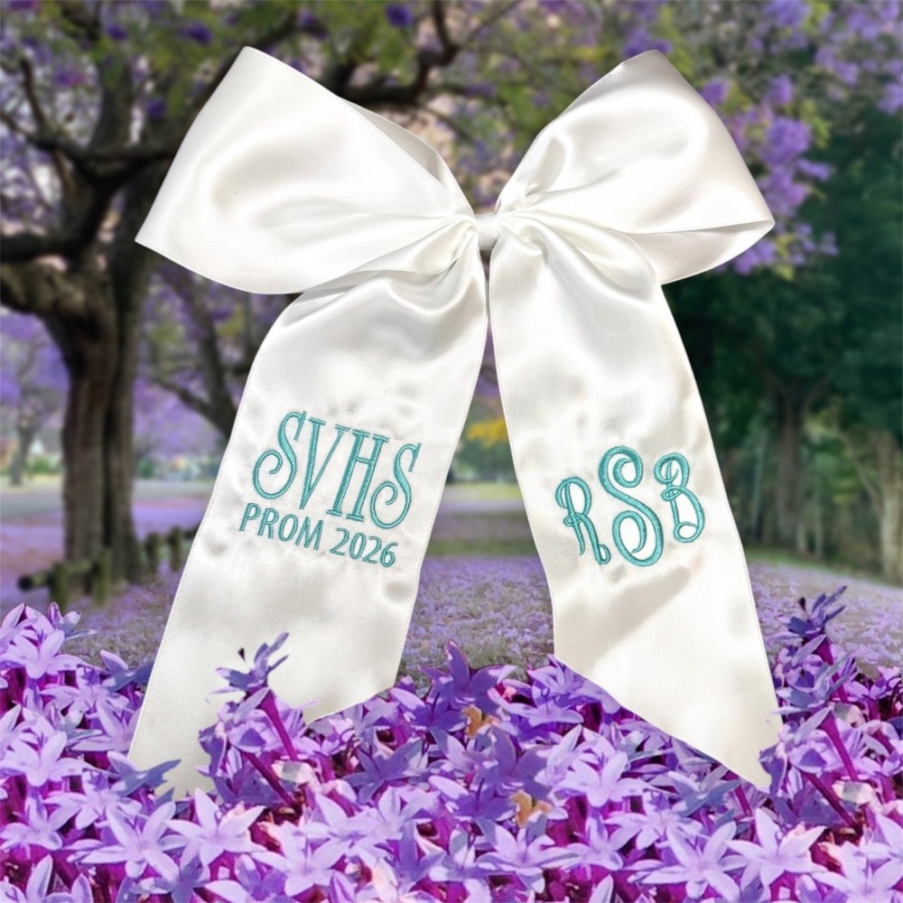 This embroidered bouquet ribbon wrap is crafted from soft, high-quality ribbon and delicately embroidered initials, monograms or custom designs. Whether you're wrapping a homecoming or prom floral bouquet, a bridal bouquet, bridesmaid flowers, or a special gift, this ribbon adds a personalized, heirloom-quality touch. The wrap ties beautifully around stems, securing them with grace while adding texture and charm to your arrangement. Ideal for school dances, weddings, anniversaries, or keepsakes.
