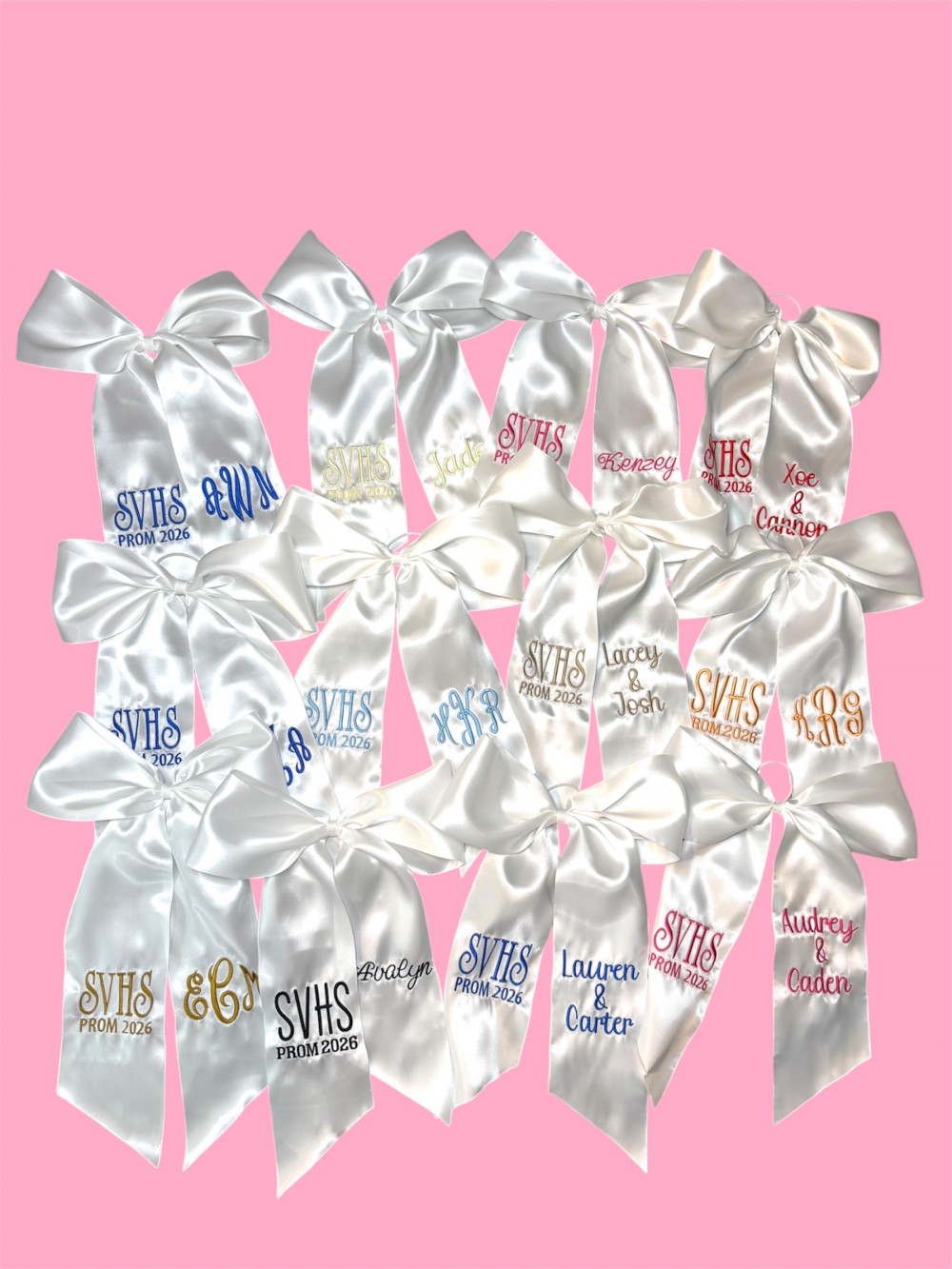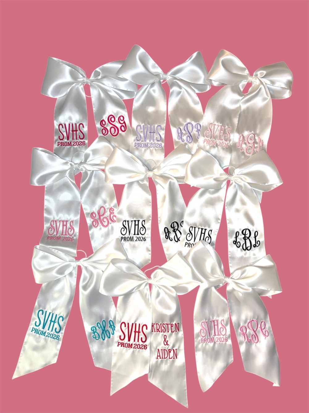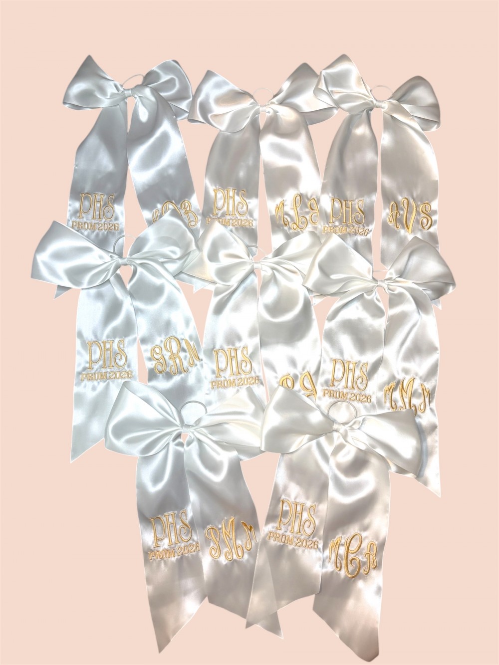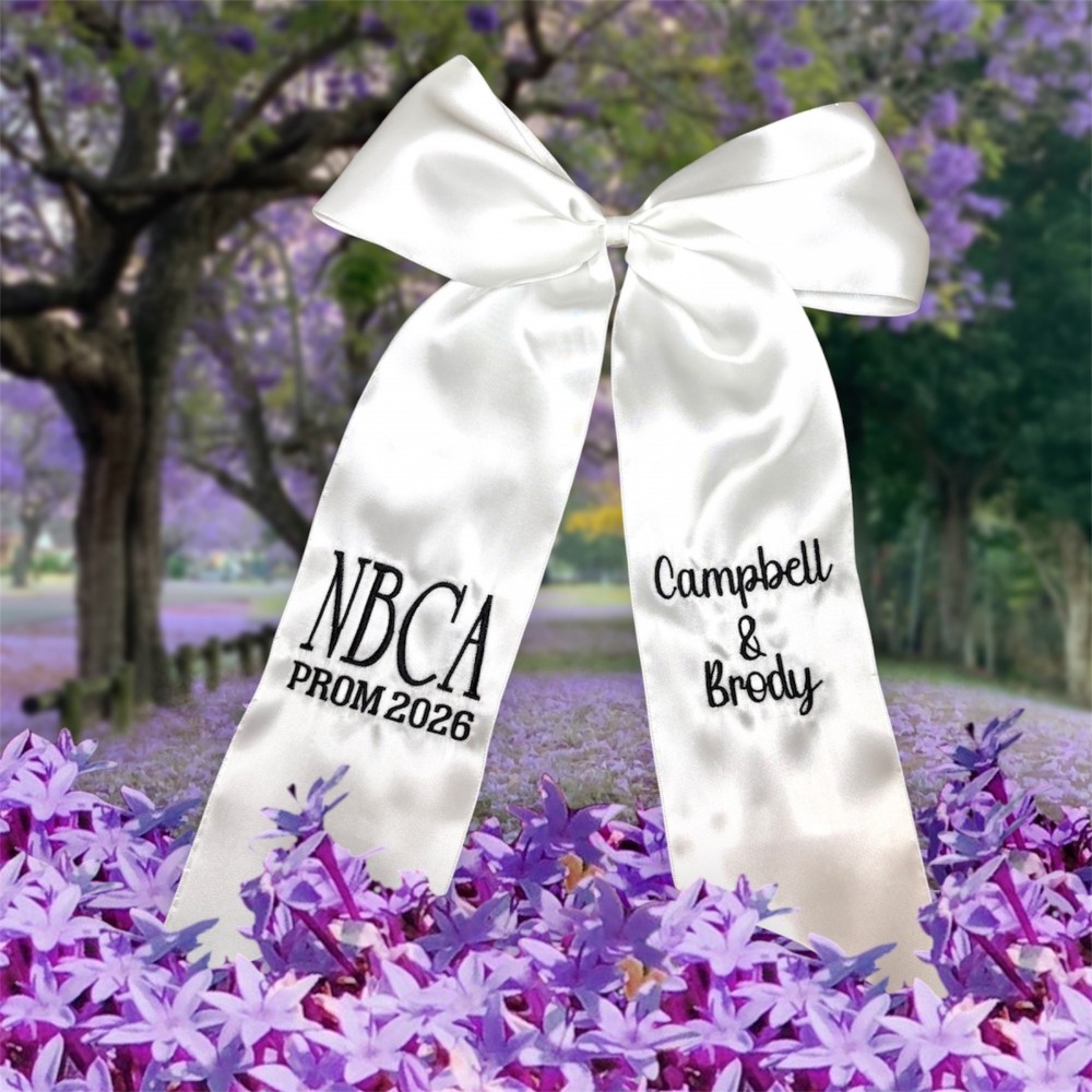 This embroidered bouquet ribbon wrap is crafted from soft, high-quality ribbon and delicately embroidered initials, monograms or custom designs. Whether you're wrapping a homecoming or prom floral bouquet, a bridal bouquet, bridesmaid flowers, or a special gift, this ribbon adds a personalized, heirloom-quality touch. The wrap ties beautifully around stems, securing them with grace while adding texture and charm to your arrangement. Ideal for school dances, weddings, anniversaries, or keepsakes.