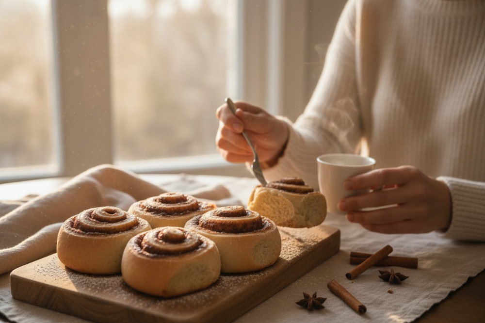 Soft, pillowy layers of naturally leavened sourdough dough, swirled with a buttery cinnamon-sugar filling and baked to golden perfection. Each roll is slow-fermented for depth of flavor, giving a subtle tang that perfectly balances the sweet, gooey center. Topped with a smooth vanilla glaze (or cream cheese frosting, if you offer that), it’s a cozy, melt-in-your-mouth treat made the old-fashioned way — with patience, love, and plenty of butter.