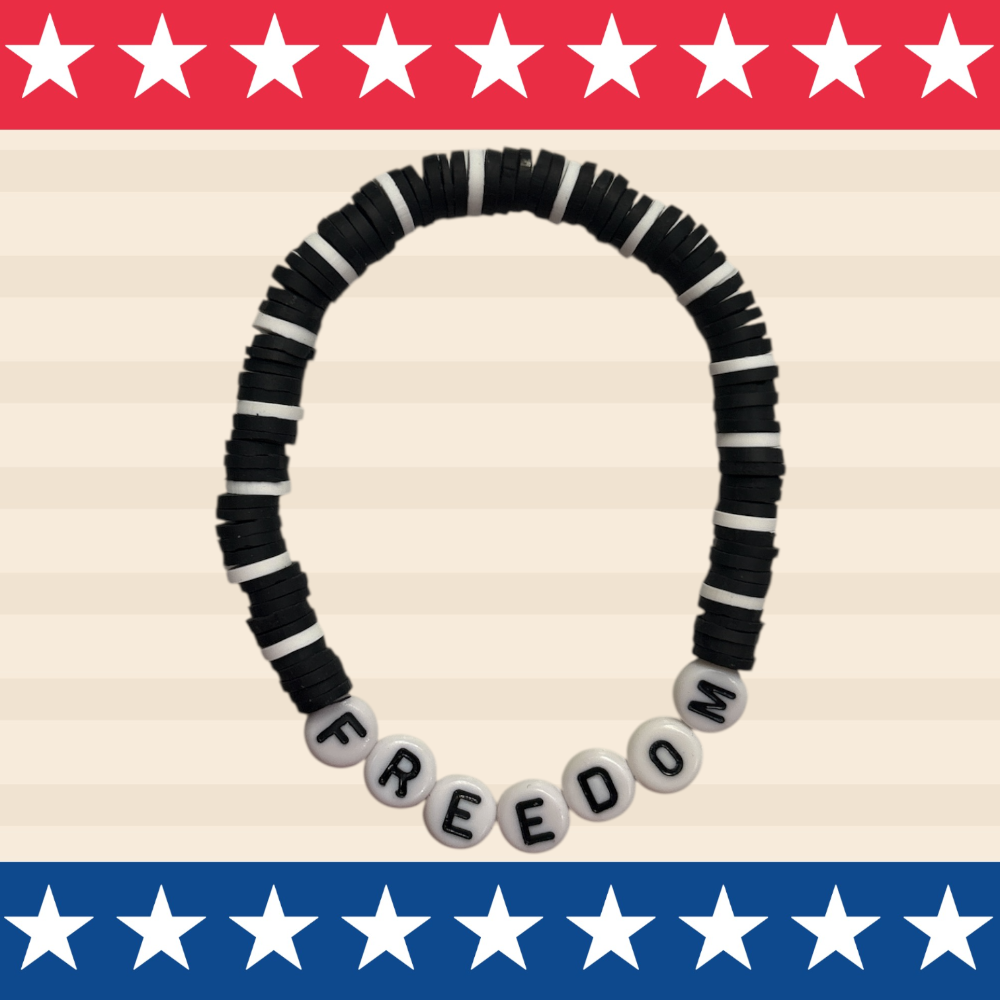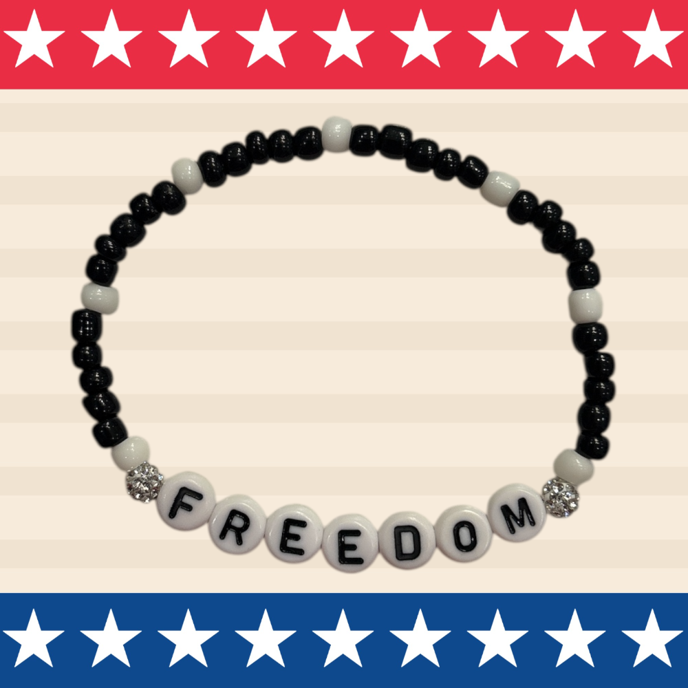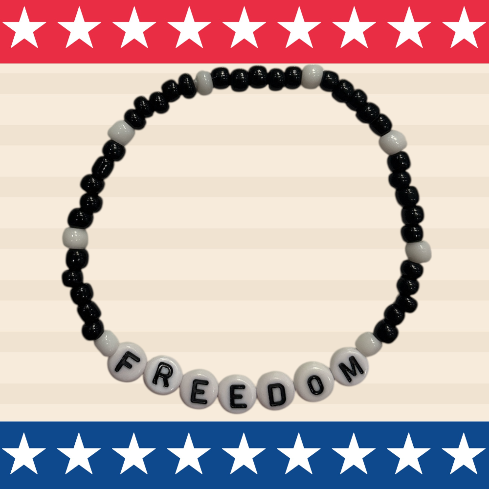 Carry a reminder of our freedom wherever you go with these handmade beaded bracelets. Add some bling for some extra shine! These bracelets are lovingly designed and crafted by Gabi (a student at SVHS) and her mom.