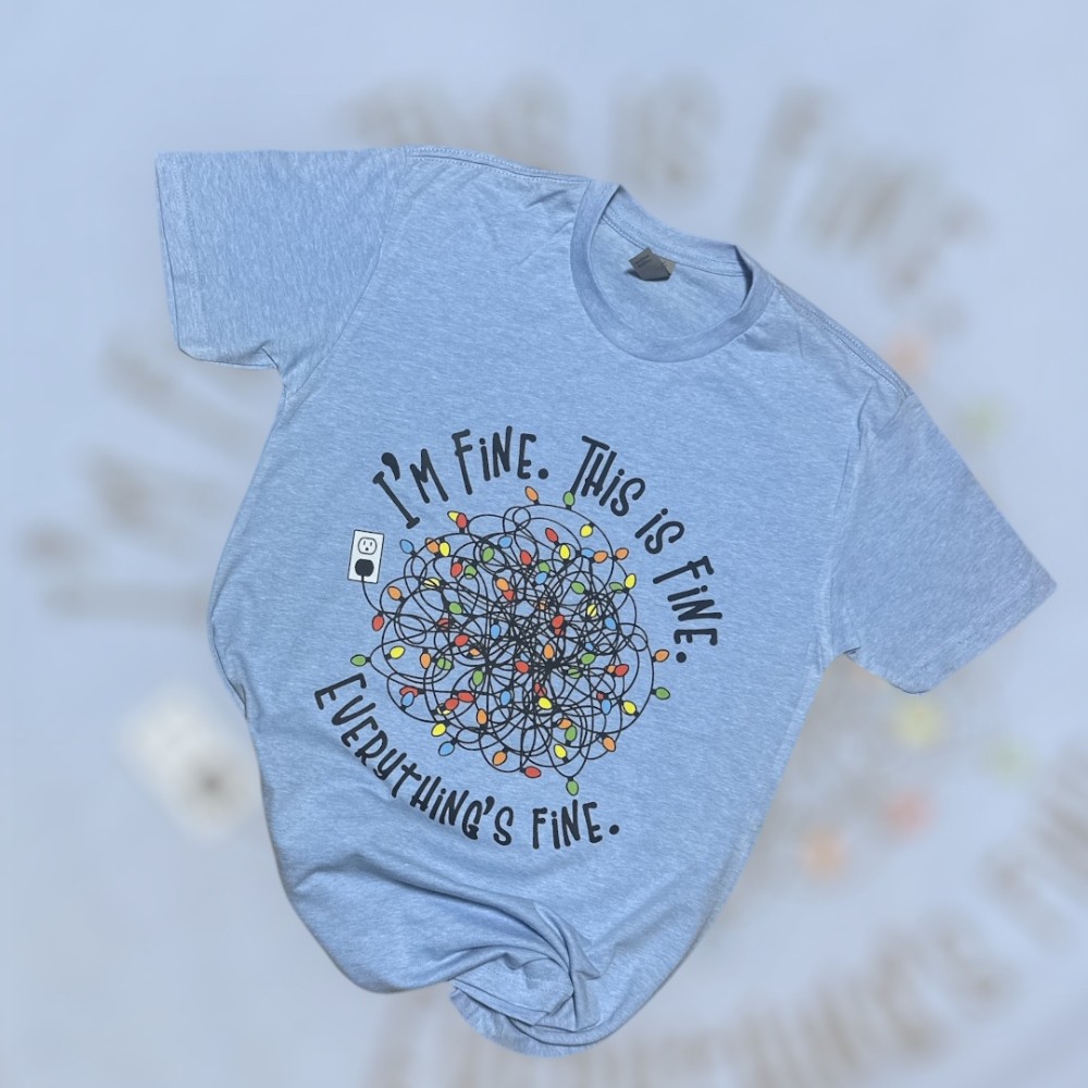 When the holiday chaos hits full force, say it loud (or silently scream it) with our “I’m Fine, This Is Fine, Everything’s Fine” Christmas Lights Tee. Featuring a hilariously mangled mess of Christmas lights, this shirt perfectly captures the festive meltdown we all pretend we’re not having.