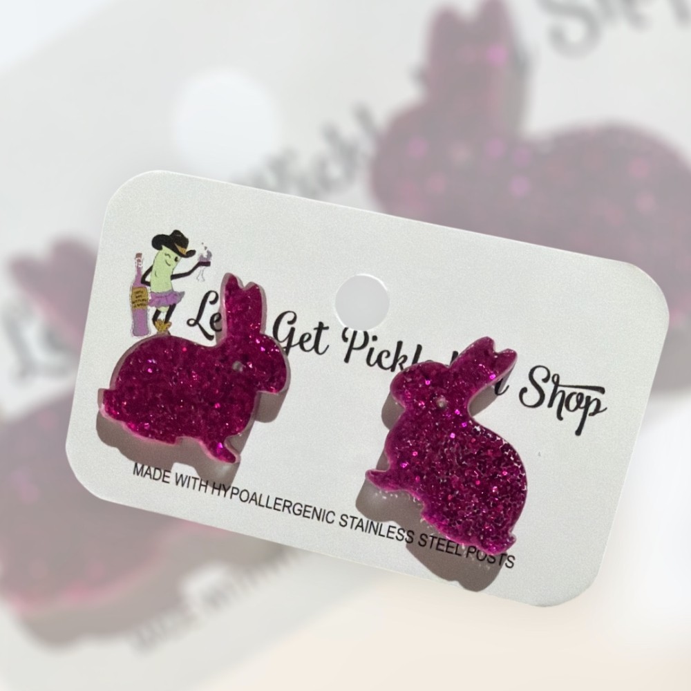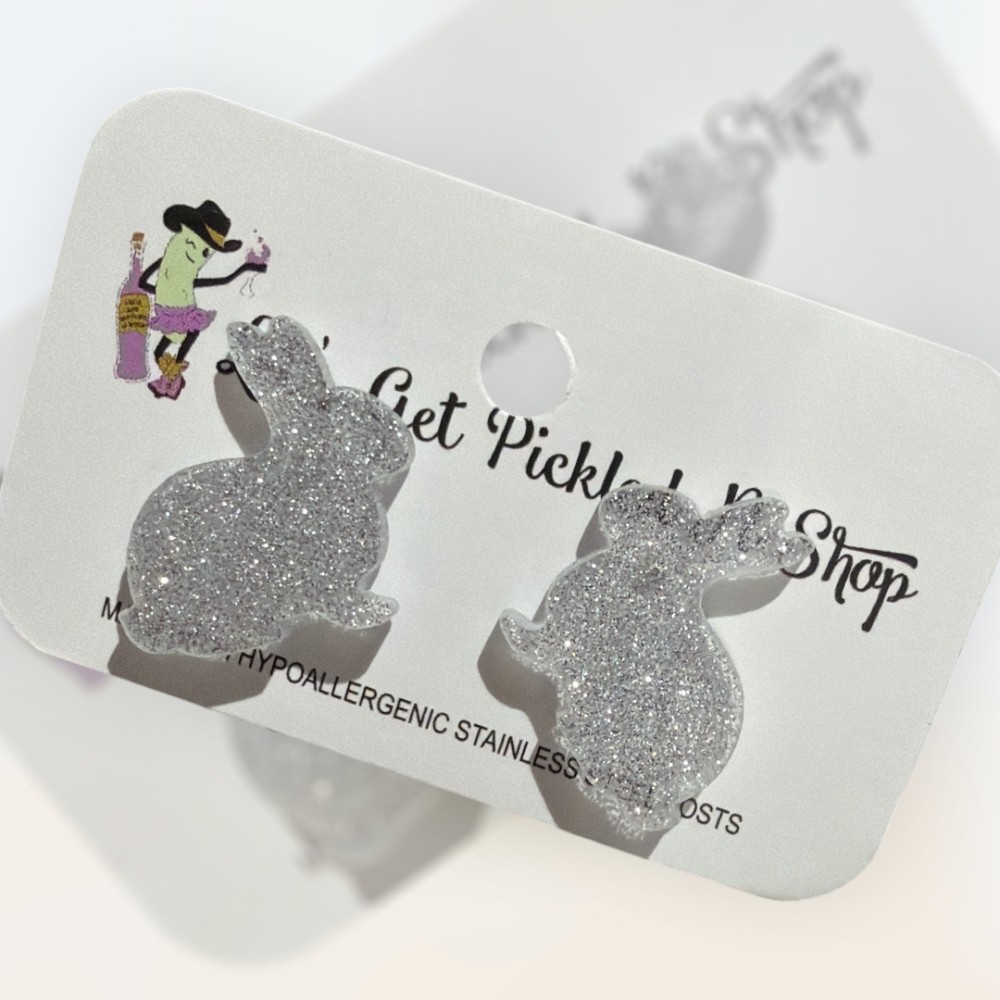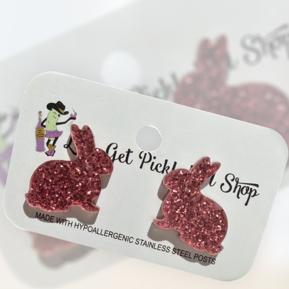 These adorable glitter rabbit acrylic cutouts are the perfect stud earrings for rabbit lovers. Measuring approximately 0.75 inches, they catch the light beautifully and are sure to glisten with every movement. Crafted from lightweight acrylic and finished with hypoallergenic stainless steel posts, they’re comfortable for everyday wear and gentle on sensitive ears. Fun, eye-catching, and full of charm, these studs make a delightful accessory for animal lovers or a sweet gift for someone special.