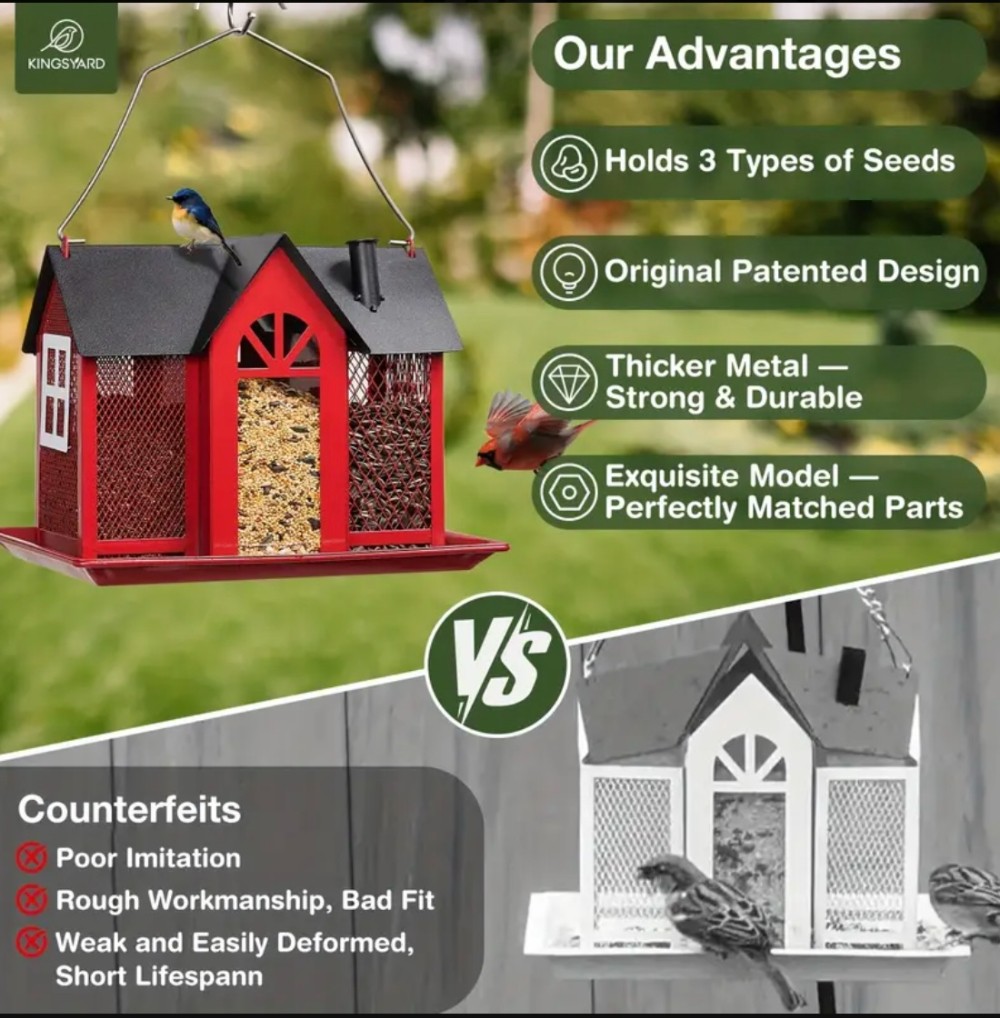 The Kingsyard Bird Feeder House is a beautiful and functional addition to any outdoor space, perfect for bird lovers and garden décor enthusiasts. Designed with a durable metal mesh construction, this weatherproof feeder features triple feeding stations, making it ideal for attracting finches, cardinals, chickadees, and other wild birds.