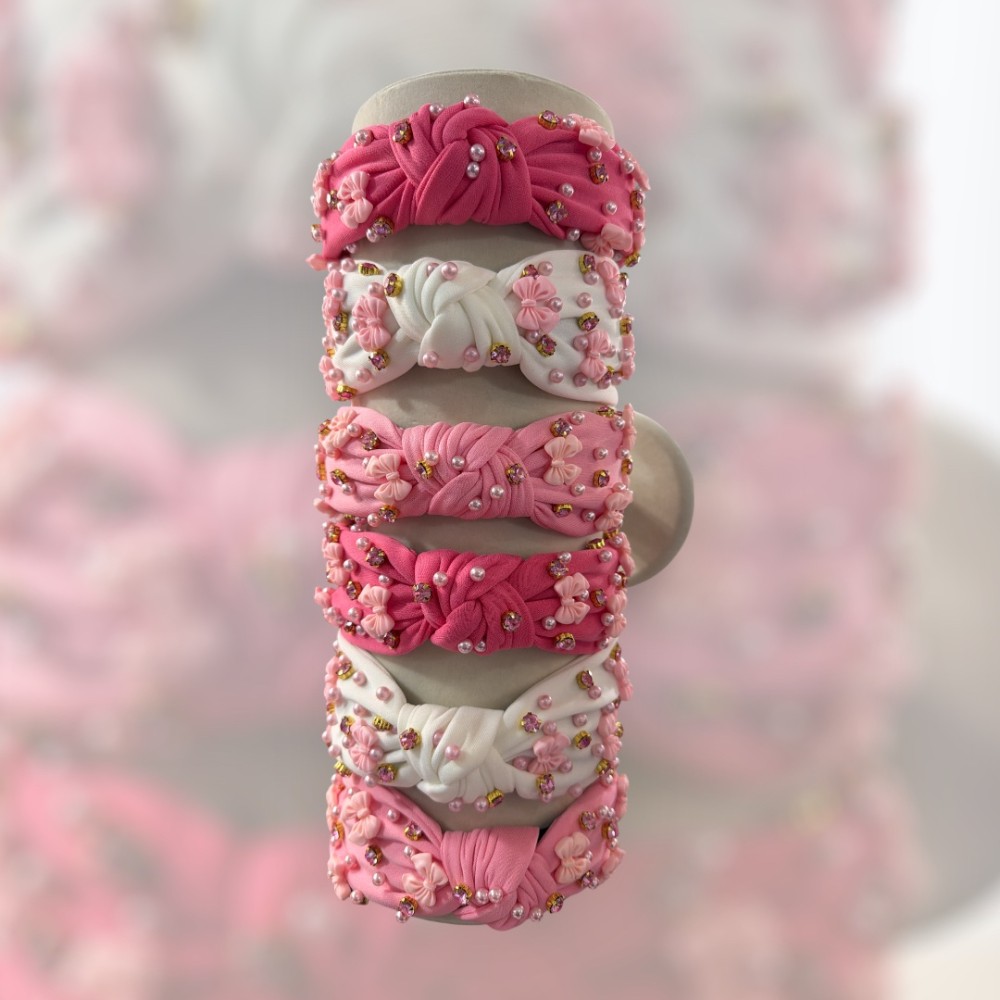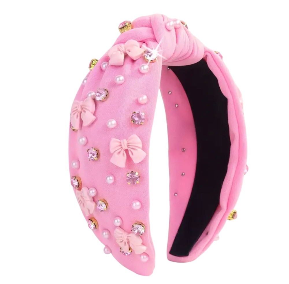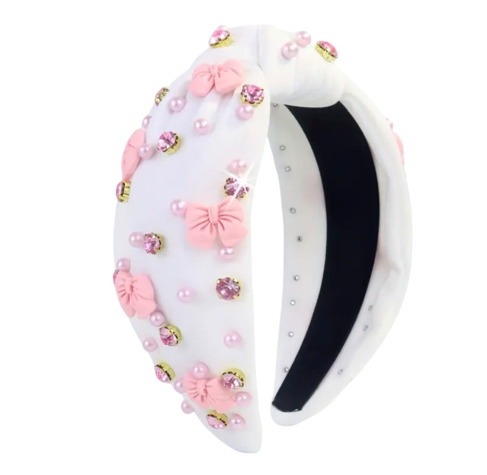 Imitation pearls, rhinestones, and bows — oh my! This adorable and comfortable knot headband is the perfect finishing touch for Valentine’s Day, Easter, or everyday wear.