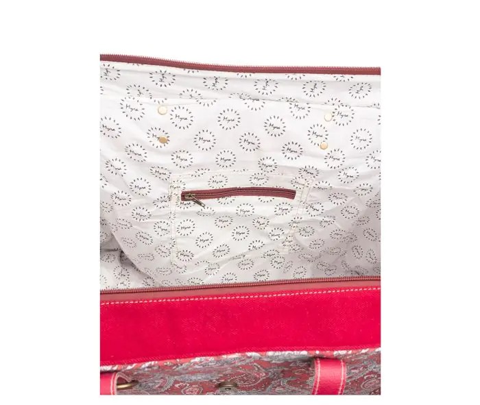 This weekender bag boasts a captivating paisley print in soft hues of pink and red, creating a visually appealing and feminine design. The intricate paisley pattern evokes a sense of elegance and whimsy, making it a standout accessory for any travel occasion. Frayed edge treatments complete the look, and the carrying straps are in a coordinated red leather. Zipper close top. Beautiful form, great function, and a chic aesthetic - this bag promises to be a beloved travel companion.
