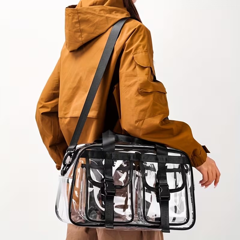 Crafted from high-quality, durable PVC, the ultra-clear design makes it easy to find what you need at a glance—ideal for busy days, events, or travel situations where transparency is a plus. Its spacious interior (15.79" x 9.45") provides plenty of room for your daily must-haves, while the two front pockets with snap-button closures keep smaller items neatly stored and within reach.