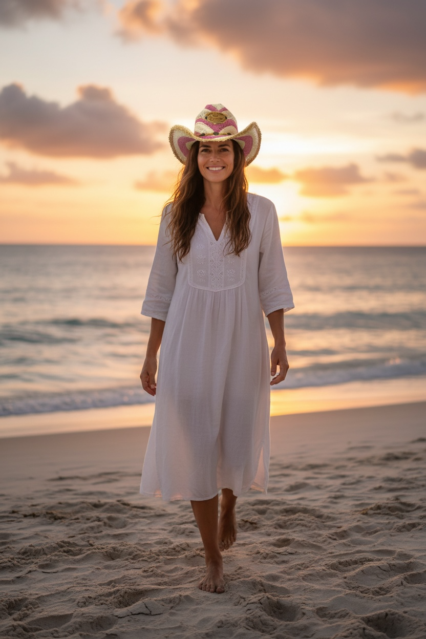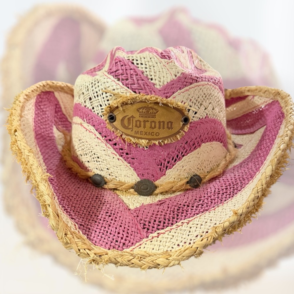 Add a splash of fun to your summer style with this bold and unique pink straw cowboy hat! Handmade in Mexico by TONPSOM, this medium-sized hat features a vibrant woven design, a wide brim with rustic frayed edges, and a leather Corona logo patch on the front. The adjustable chin strap keeps it secure while you’re dancing at festivals, lounging at the beach, or just soaking up the sun in style.