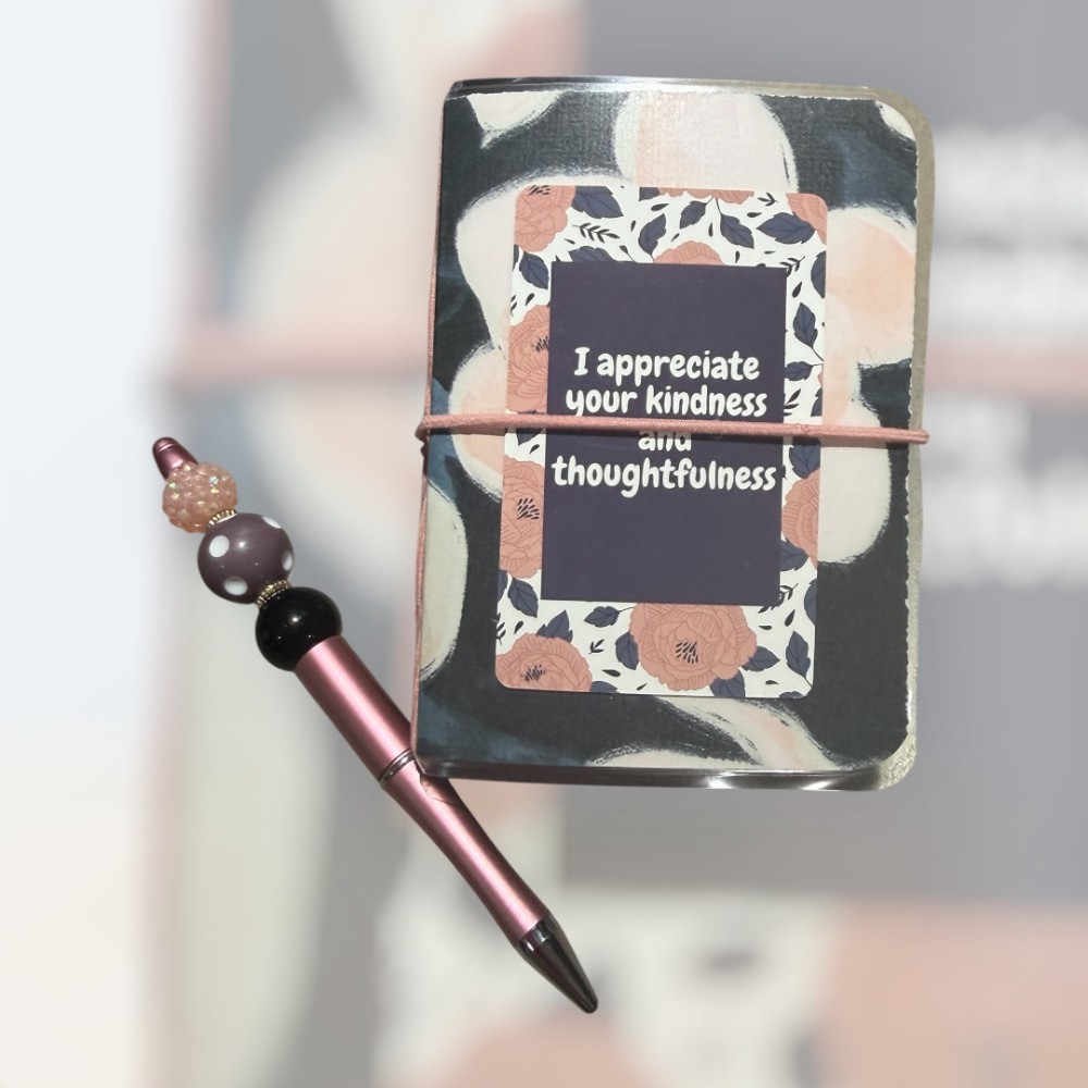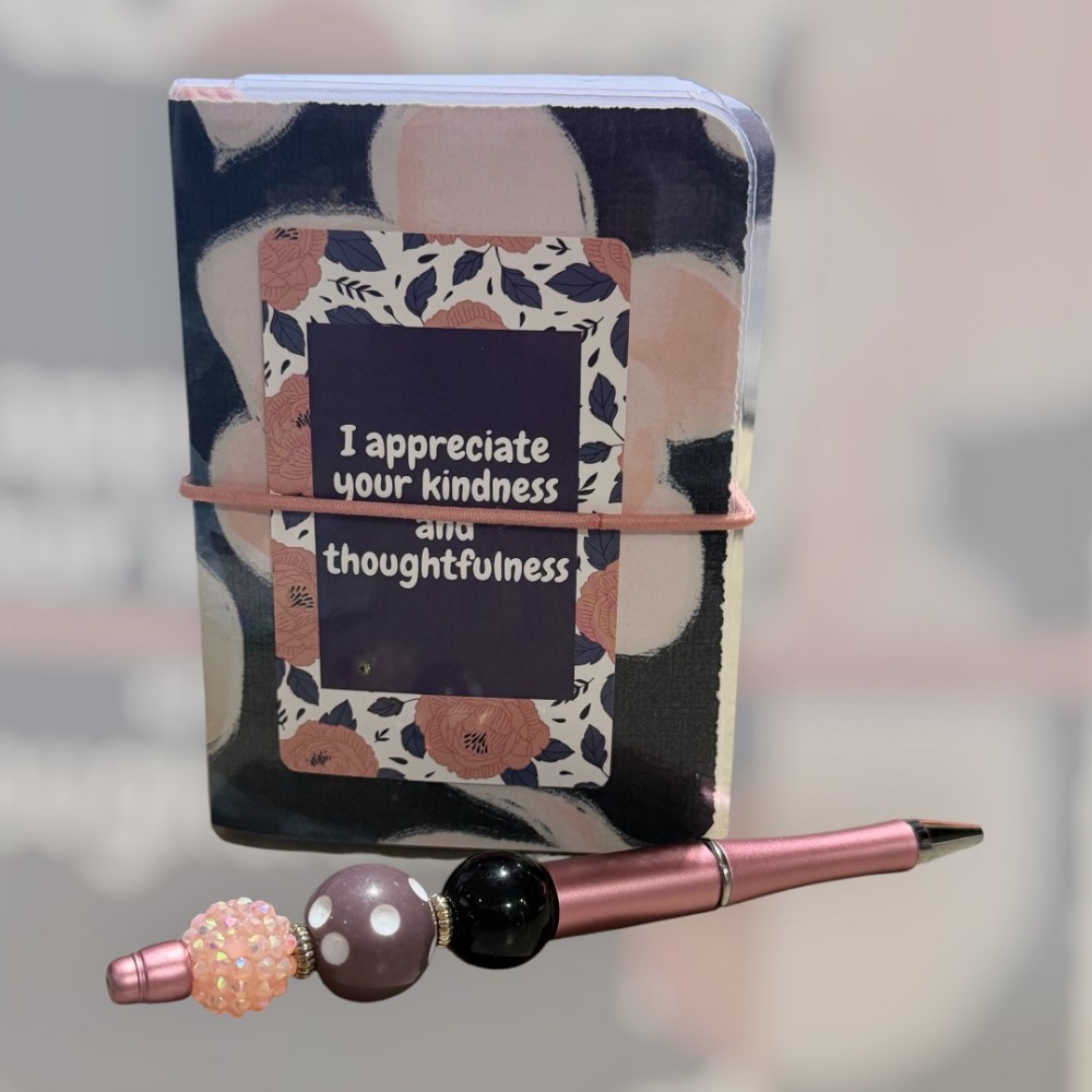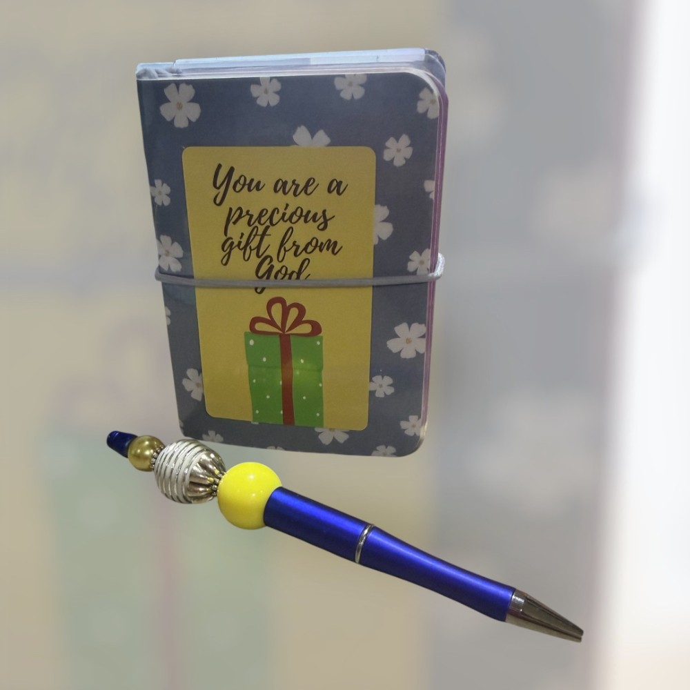 Handmade with love, this mini portfolio/traveler’s handbook is both charming and practical. Designed to fit perfectly in your purse or travel bag, it includes three mini composition notebooks and an elastic band closure to keep everything neatly in place. It’s ideal for jotting down notes, little memories, or reminders on the go. The set also includes a matching hand-beaded pen, adding a special handcrafted touch. Measuring approximately 4 1/2" x 4" x 1", this sweet and functional piece makes a thoughtful and unique gift for a friend or loved one.