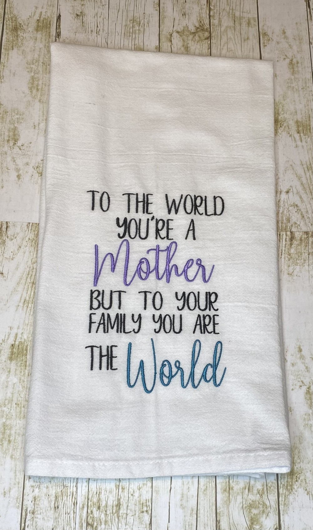 This will show your mom just how much you care. This quality Flour Sack towel is made of 100% Pure Rung Spin Cotton and measures approximately 28x28". These unique multipurpose towels are highly absorbent. Machine wash cold, tumble dry low. These towels make the perfect for gift for your mom.