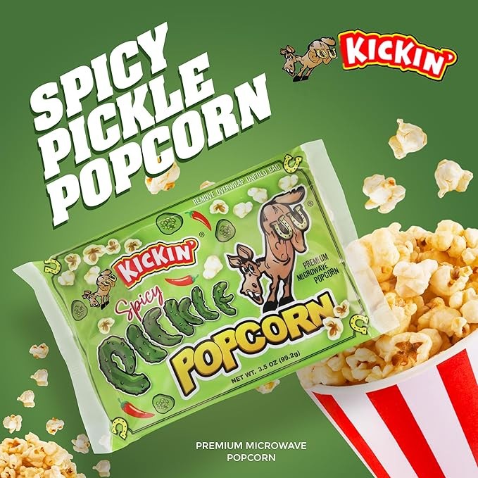 SPICY PICKLE - Made with real Pickle seasoning, this flavored popcorn bag combines the taste of real dill pickle, finger lickin’ flavor that’s simply irresistible! This Pickle popcorn is too dang good to pass up, you just have to give it a try! Rest assured, your tastebuds will thank you.
