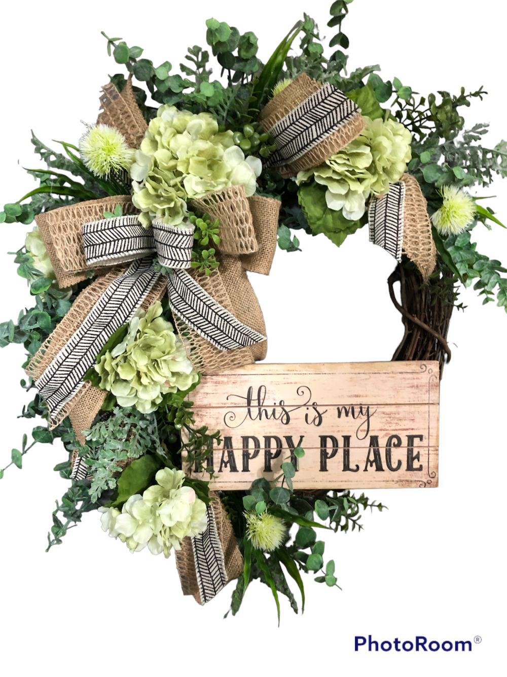 Your "happy place" grapevine wreath exudes warmth and tranquility. The grapevine base provides a rustic charm, complemented by lush green flora and various greenery, creating a lively and natural arrangement. Burlap accents add a touch of earthy texture, while black and white ribbon enhances the wreath's elegance. With the accompanying sign declaring "This is my happy place," the overall design creates a welcoming and joyful atmosphere wherever it's displayed.